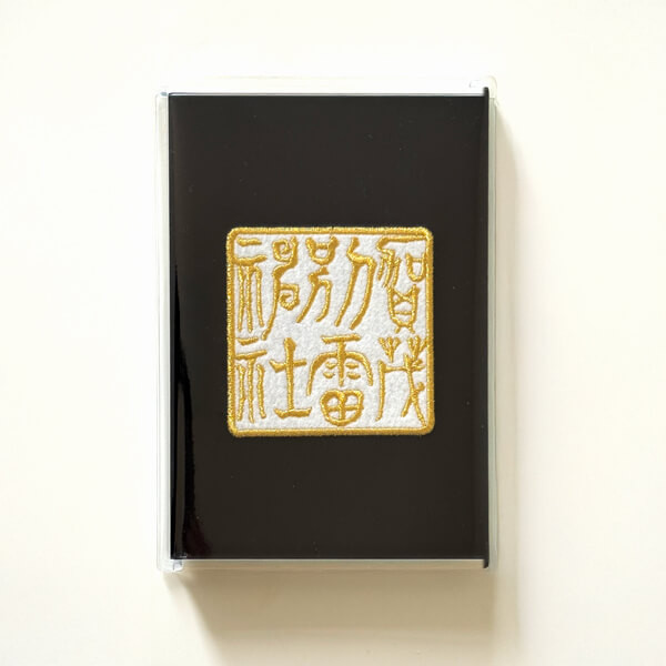 当社御配神の「玉依姫」を鮮やかに金糸を多用して西陣織で仕上げています。表裏表紙を合わせるとひとつの絵の作品となります。