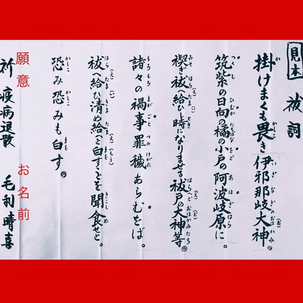 「祓詞(はらえことば)」を、お手元にあるA4程度の紙に、すべて(ふりがな省略可)書き写し、願意と、お名前を最後にお書きください。