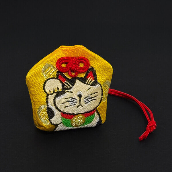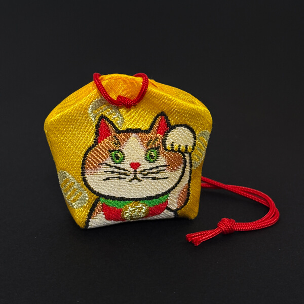 お守りの両面に当社の看板猫「たま」と「ひめ」が描かれた、福を招く招き猫お守りです。